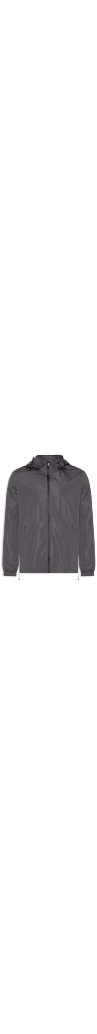 A jaqueta cinza é confeccionada em tactel sem elasticidade. A peça de modelo corta-vento solta ao corpo possui capuz com cordão embutido, mangas longas com ajuste nos punhos, recortes frontais, bolsos frontais embutidos com fechamento por zíper, forro em mesh, cordão embutido na barra para ajuste interno nas partes laterais e fechamento frontal por zíper.