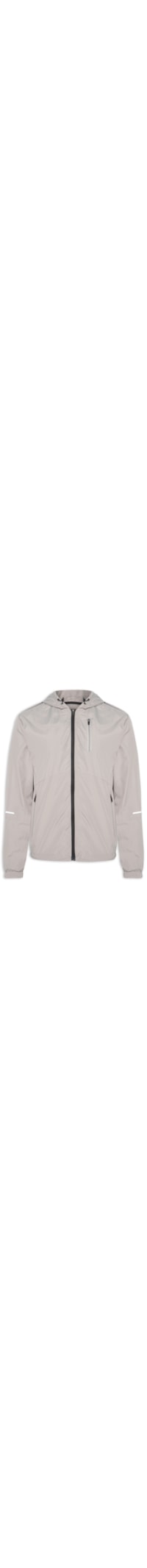 A jaqueta cinza é confeccionada em tecido leve sem elasticidade. A peça solta ao corpo possui capuz com elástico embutido para ajuste, mangas longas com elástico embutido nos punhos, bolsos frontais com fechamento por zíper, recorte frontal, recorte posterior, detalhe em material refletivo aplicado na parte posterior e nas mangas, forro em mesh, elástico embutido na barra para ajuste e fechamento por zíper frontal.