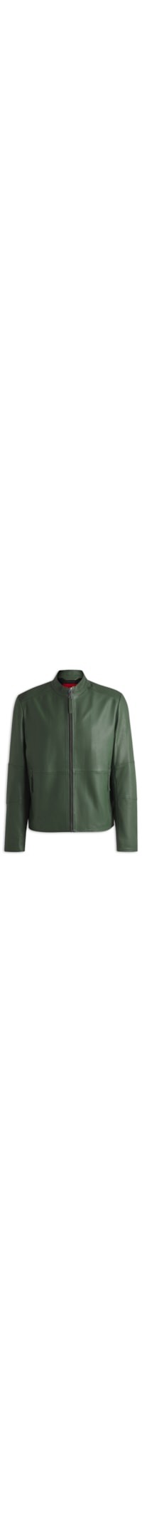 A jaqueta verde é confeccionada em couro sem elasticidade. A peça solta ao corpo possui gola média, mangas longas, bolsos frontais embutidos com fechamento por zíper, recortes posteriores e frontais, tiras, forro e fechamento frontal por zíper com puxador.