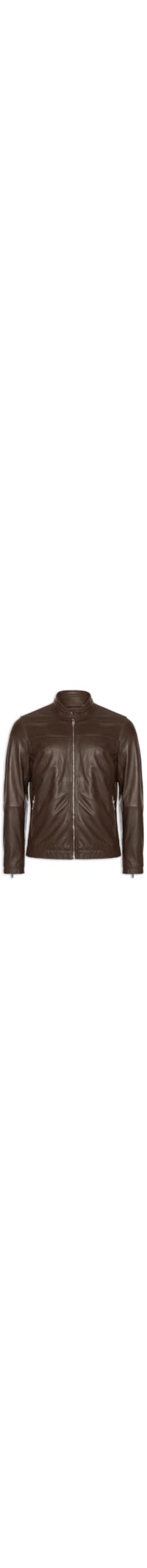 A jaqueta marrom é confeccionada em couro sem elasticidade. A peça solta ao corpo, possui gola arredondada, mangas longas com ajuste nos punhos, bolsos frontais embutidos com fechamento por zíper, recortes frontais e posteriores, forro, bolso interno embutido com fechamento por zíper e fechamento frontal por zíper e botão de pressão na gola.