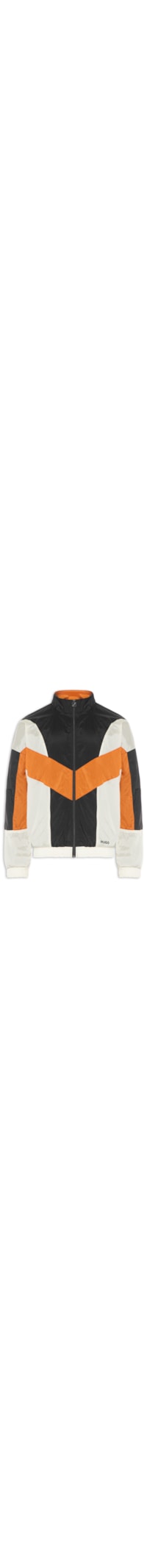 A jaqueta preta é confeccionada em nylon. A peça possui gola careca, ombros estendidos, mangas longas, recortes frontais e posteriores em cores contrastantes, bolsos frontais embutidos com fechamento por zíper, nome emborrachado da marca aplicado na parte frontal da barra, forro, shape solto e fechamento frontal por zíper.