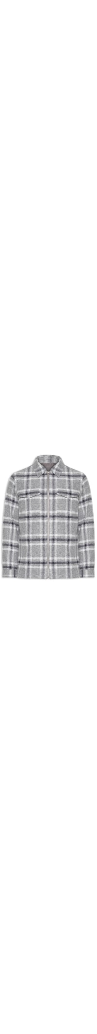 A jaqueta cinza é confeccionado em tecido encorpado sem elasticidade. A peça solta ao corpo possui colarinho clássico, mangas longas com ajuste nos punhos, bolsos frontais com aba sobreposta na altura do tórax, recorte posterior, forro, padronagem xadrez em cores contrastantes e fechamento frontal por zíper.