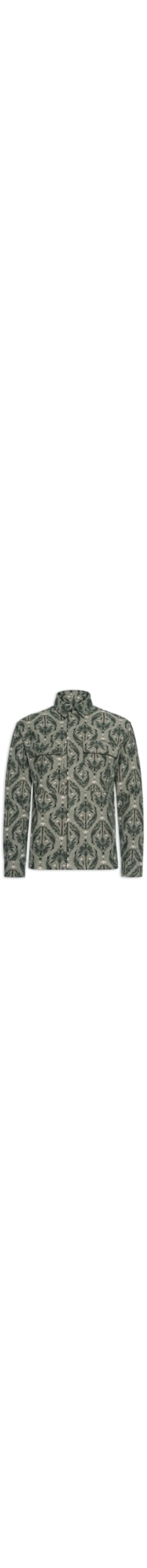 A jaqueta verde é confeccionada em jacquard sem elasticidade. A peça solta ao corpo possui colarinho clássico, mangas longas com ajuste nos punhos, bolsos frontais com aba sobreposta e fechamento por botão de pressão, pequenas fendas laterais, recortes frontais e posteriores, estampa floral em cores contrastantes e fechamento frontal por botões de pressão com vista sobreposta.