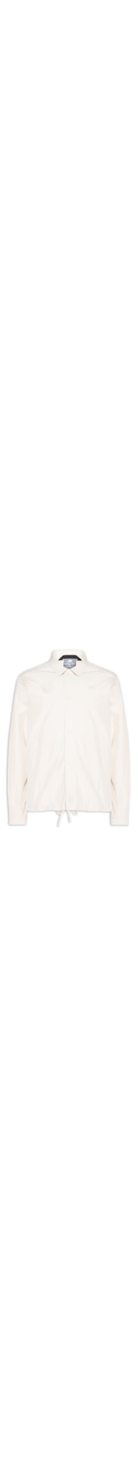 A jaqueta bege é confeccionada em tactel. A peça possui gola clássica, mangas longas com punhos elásticos, ombros com caimento regular, shape reto, bolsos frontais embutidos, logo da marca aplicado na altura do tórax, barra com ajuste por cordão interno, forro interno e fechamento frontal por botões de pressão.
