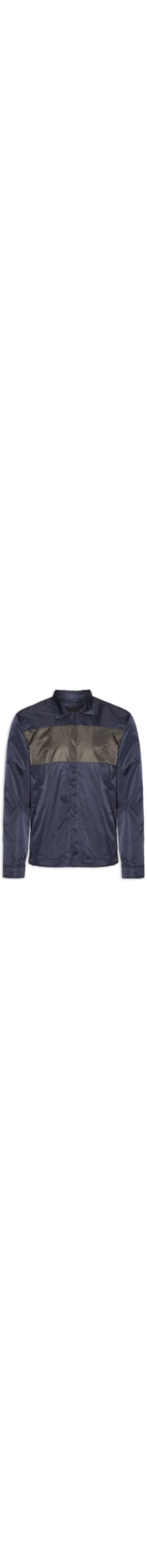 A jaqueta azul marinho é confeccionada em nylon. A peça possui gola alta, mangas longas, recorte frontal sobreposto em cor contrastante, bolsos frontais, fechamento frontal por zíper, caimento reto, shape solto e acabamento pespontado.