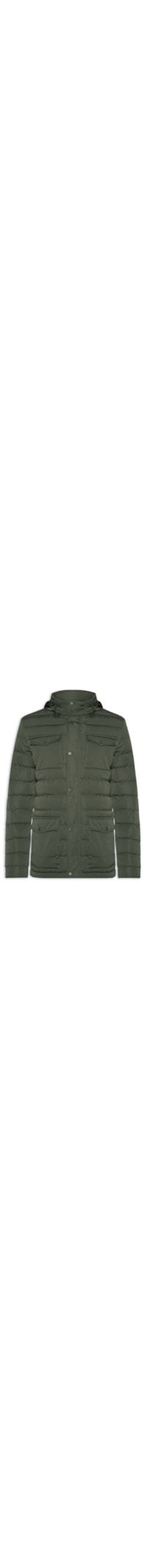 A jaqueta verde é confeccionada em tactel sem elasticidade. A peça de modelo puffer* possui gola alta, compartimento com capuz embutido e fechamento por zíper, mangas longas com ajuste por botão nos punhos, bolsos frontais embutidos com lapela sobreoista e fechamento por botão de pressão, comprimento alongado, forro e fechamento frontal por zíper e botões de pressão.