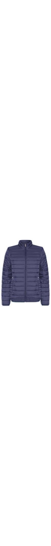 A jaqueta azul marinho é confeccionada em nylon sem elasticidade. A peça solta ao corpo de modelo *puffer possui gola alta, mangas longas, dois bolsos frontais embutidos com fechamento por zíper, elástico embutido nos punhos e barra e fechamento frontal por zíper.