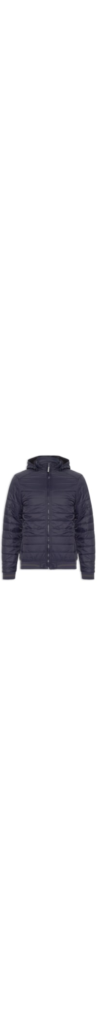 A jaqueta azul é confeccionada em nylon com superfície em matelassê e sem elasticidade. A peça modelo puffer* solta ao corpo possui gola com capuz removível, bolsos frontais embutidos com fechamento por zíper, mangas longas com elástico embutido nos punhos, forro e fechamento frontal por zíper.