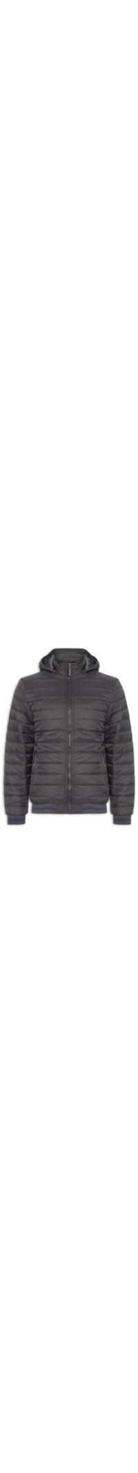 A jaqueta cinza é confeccionada em nylon com superfície em matelassê e sem elasticidade. A peça modelo puffer* solta ao corpo possui gola com capuz removível, bolsos frontais embutidos com fechamento por zíper, mangas longas com elástico embutido nos punhos, forro e fechamento frontal por zíper.