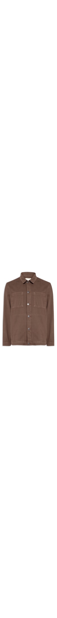 A jaqueta marrom é confeccionada em sarja sem elasticidade. A peça solta ao corpo possui gola clássica, mangas longas com abotoamento nos punhos, bolsos frontais aplicados na altura do tórax, recortes posteriores e fechamento frontal em botões.