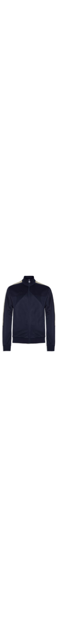 A jaqueta azul é confeccionada em malha leve com baixa elasticidade. A peça solta ao corpo possui gola alta, mangas longas, recortes frontais, dois bolsos laterais, listras e nome da marca aplicada nas mangas em cor contrastante, e fechamento frontal por zíper.