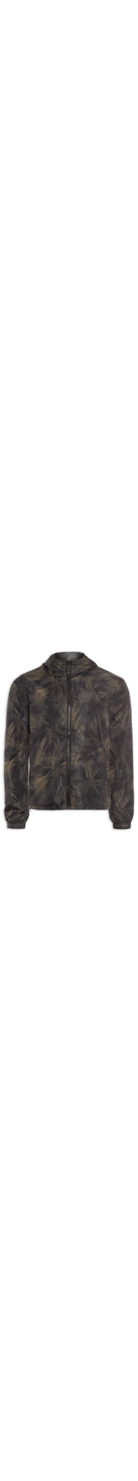 A jaqueta verde é confeccionada em tactel. A peça possui gola alta com capuz aplicado, mangas longas, cordões para ajuste na barra, ajuste por velcro nos punhos com detalhe emborrachado com o nome da marca, forro em tela, estampa de folhagem, fechamento frontal por zíper, caimento reto e acabamento pespontado.