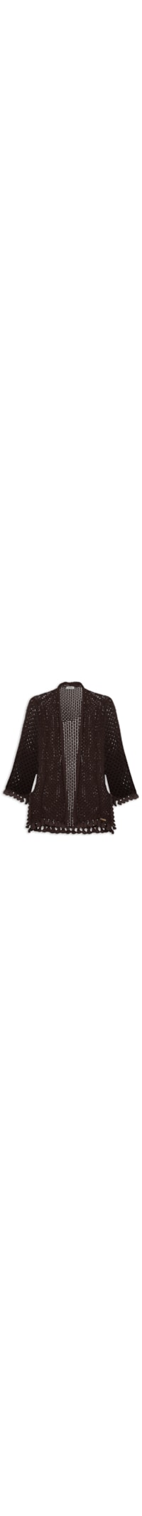O kimono marrom é confeccionado em tricot com baixa elasticidade. A peça solta ao corpo possui mangas longas, aplicação de passamanaria nos acabamentos, transparência e recortes vazados.