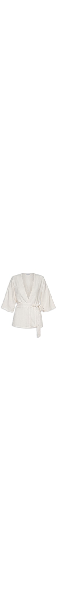 O kimono bege é confeccionado em tecido maquinetado com toque de linho sem elasticidade. A peça solta ao corpo possui mangas 3/4 amplas, ombros estendidos, passantes laterais na altura da cintura e fios de lurex na cor prata. Acompanha cinto no mesmo tecido e cor para uso opcional.