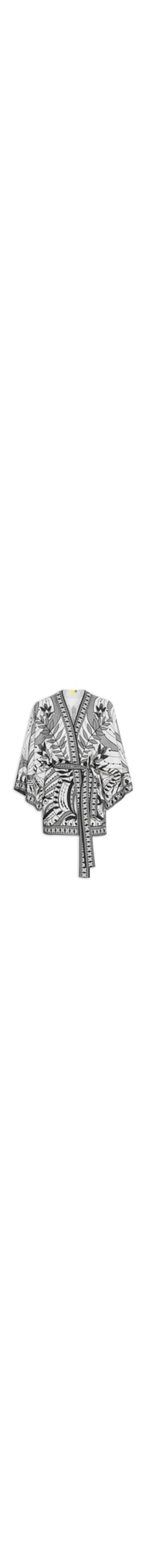 O kimono preto é confeccionado em tecido leve com toque de linho sem elasticidade. A peça solta ao corpo, possui abertura frontal, ombros estendidos, mangas amplas de comprimento 7/8, mix de estampas em cor contrastante, leve transparência e barra mullet* arredondada. Acompanha faixa média em mesmo tecido para amarração opcional na cintura.
