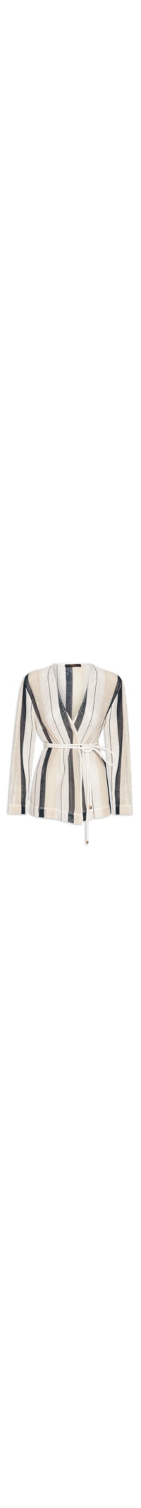 O kimono off white é confeccionado em tela sem elasticidade. A peça solta ao corpo possui mangas longas, ombros estendidos e padronagem listrada em cores contrastantes. Acompanha cinto em cordão médio regulável por amarração.