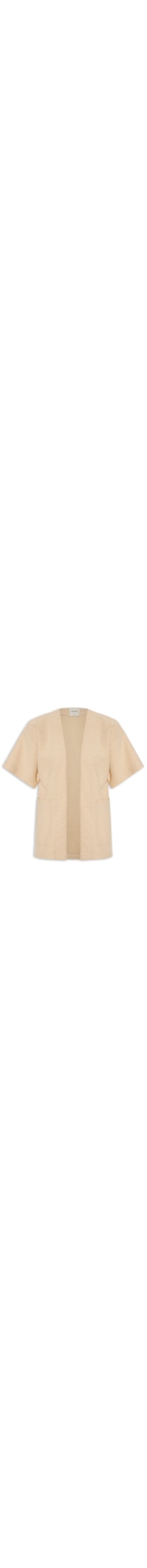 O kimono bege é confeccionado em malha ecológica com superfície texturizada sem elasticidade. A peça solta ao corpo possui ombros estendidos, mangas curtas amplas, bolsos frontais e comprimento alongado.