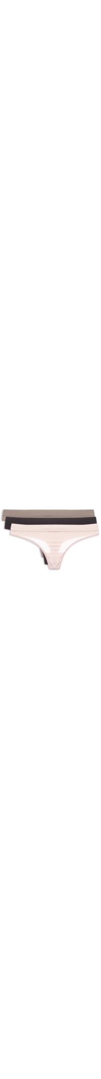 O kit de calcinhas contém as cores preta, rosa e bege e são confeccionada em microfibra. A peça de modelo fio dental possui laterais médias, forro e acabamento elástico.