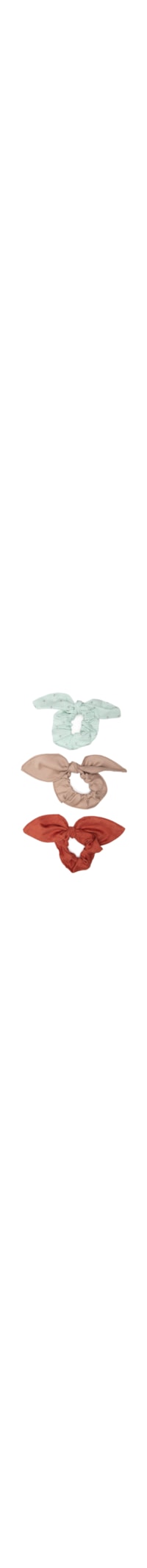 O kit de scrunchies contém 3 peças nas cores vermelho, marrom e azul produzidas em material têxtil. A peça possui formato redondo, elástico embutido, laço e acabamento pespontado. A scrunchie azul possui estampa listrada em cor contrastante e bordado geométrico cinza.