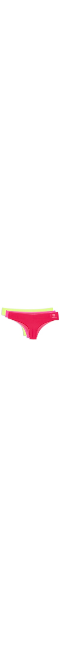 O kit de calcinhas contém três peças nas cores neons verde e rosa em dois tons diferentes, confeccionadas em malha de poliamida. As peças possuem cintura baixa, nome da marca metalizado aplicado na parte frontal em cor contrastante, shape justo, caimento reto, forro e acabamento em corte a fio.