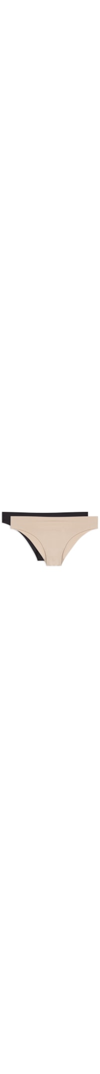 O kit de calcinhas contém 2 calcinhas nas cores bege e preto confeccionadas em malha com alta elasticidade. As peças de modelo tanga possuem laterais médias e acabamento em corte à fio.