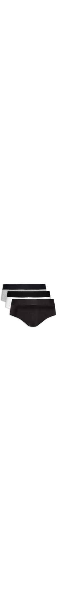 O kit contém três cuecas nas cores preto, cinza e branco confeccionadas em malha de algodão pima com alta elasticidade. As peças de modelo brief possuem cintura média, cós elástico em cor contrastente, recortes frontais anatômicos e acabamento elástico.