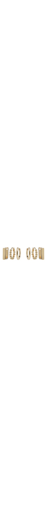 O kit de brincos dourados contém 3 peças produzidas em metal com banho ouro 18k. As peças de modelo argola possuem tamanhos distintos, espessura fina, acabamento polido e fechamento por encaixe. A primeira argola possui formato quadrado e superfície lisa, a segunda argola possui formato redondo e superfície em microesferas e a terceira argola formato redondo e superfície lisa.