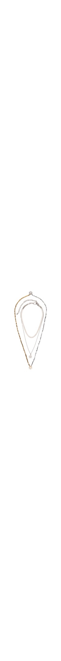 O kit de colares contém 2 peças produzidas em cordão. A peça maior possui espessura média, metade da peça em metal com cor contrastante, miçangas metálicas, pingentes nas partes posterior e frontal com formato figurativo de estrela e com cristais, sendo o pingente posterior em metal com cor contrastante e não possui fechamento. A peça menor possui corrente dupla sendo a corrente menor com espessura média e cristais e a corrente maior fina em elos metálicos finos com pingente com formato figurativo de estrela com cristais, extensor em corrente com elos finos e com pingente da tag da marca e fechamento posterior por fecho lagosta.