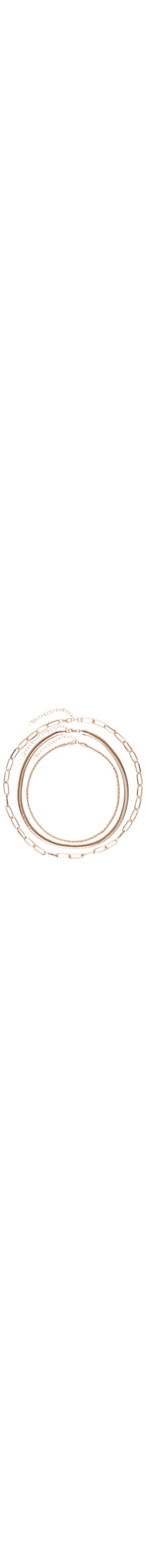 O kit de colares dourados é produzido em metal. A peça possui espessura média, 3 correntes separadas com diferentes elos e tamanhos e fechamento posterior por fecho lagosta.