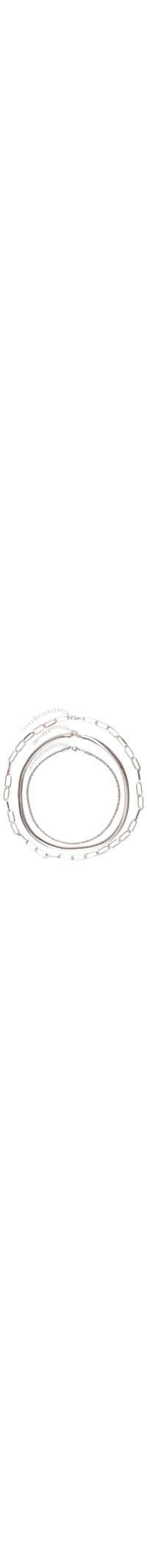 O kit de colares prateados é produzido em metal. A peça possui espessura média, 3 correntes separadas com diferentes elos e tamanhos e fechamento posterior por fecho lagosta.