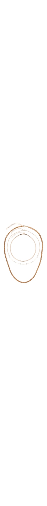 O kit de colares dourados contém 3 peças produzidas em metal. A peça maior possui corrente de modelo cordão baiano com espessura média, extensor, acabamento polido e fechamento posterior por fecho lagosta. A peça média possui corrente de elos finos, extensor, pedrarias aplicadas na parte frontal e fechamento posterior por fecho lagosta. A peça menor possui corrente de elos com espessura média, detalhes vazados, extensor, acabamento polido e fechamento posterior por fecho lagosta.