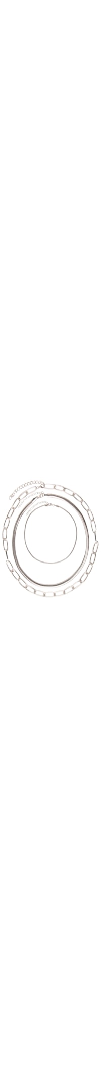 O kit de colares prateados é produzido em metal. A peça possui espessura média, 3 correntes separadas com diferentes elos e tamanhos e fechamento posterior por fechos lagosta.