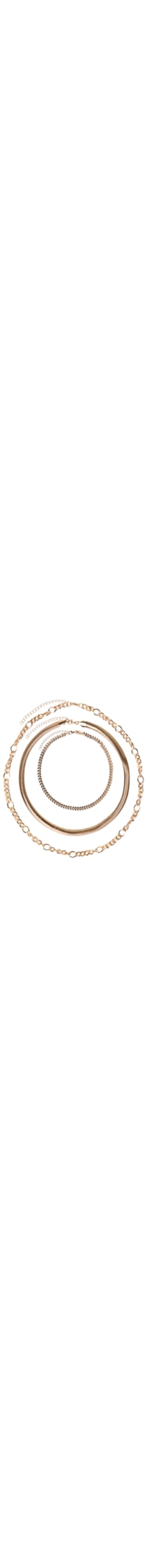 O kit de colares dourados é produzido em metal. A peça possui espessura média, 3 correntes separadas com diferentes elos e tamanhos e fechamento posterior por fechos lagosta.