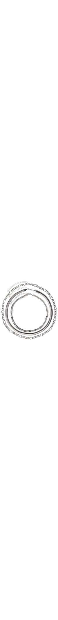 O kit de colares prateados é produzido em metal. A peça possui espessura média, 3 correntes separadas com diferentes elos e tamanhos e fechamento posterior por fechos lagosta.