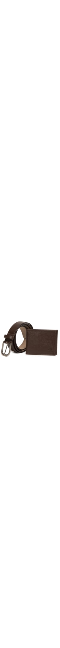 O kit presenteável contém um cinto e uma carteira produzidos em couro na cor marrom. O cinto possui espessura média, logo da marca timbrado em relevo na ponteira, cinco perfuros, passante fixo e fivela em metal. A carteira possui tamanho pequeno, formato retangular, logo da marca timbrado em relevo na parte frontal, compartimento para cédulas, bolso embutido e divisórias para cartões.