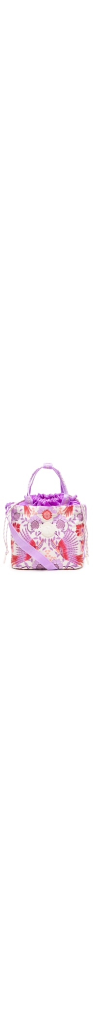 A lancheira roxa contém 3 peças, sendo uma bolsa produzida em lona e duas marmitas produzidas em plástico. A bolsa possui tamanho pequeno, forro em PVC térmico, tag da marca emborrachada aplicada na parte frontal, mix de estampas em cores contrastantes, alças de mão em gogurão com botão de pressão aplicado, alça longa regulável, nome da marca em baixo revelo nas alças, base reta e fechamento superior por cordão. As marmitas possuem formato retangular, divisórias e fechamento por tampa hermética. Acompanha faixa elástica com estampa de cogumelos para uso opcional nas marmitas.