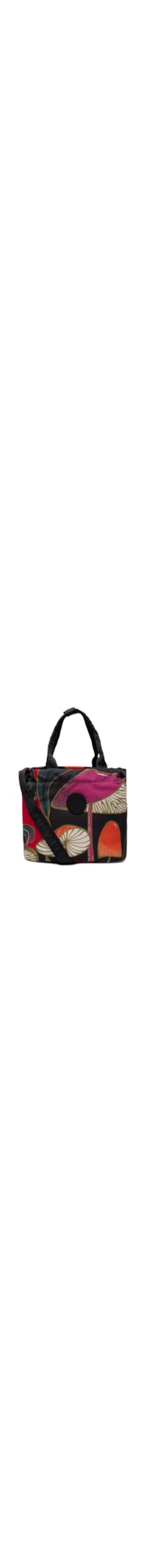 A lancheira preta contém 3 peças, sendo uma bolsa produzida em lona e duas marmitas produzidas em plástico. A bolsa possui tamanho pequeno, forro em PVC térmico, tag da marca emborrachada aplicada na parte frontal, estampa figurativa de cogumelos em cores contrastantes, alças de mão em gogurão com botão de pressão aplicado, alça longa regulável, nome da marca em baixo revelo nas alças, base reta e fechamento superior por cordão. As marmitas possuem formato retangular, divisórias e fechamento por tampa hermética. Acompanha faixa elástica com estampa de cogumelos para uso opcional nas marmitas.