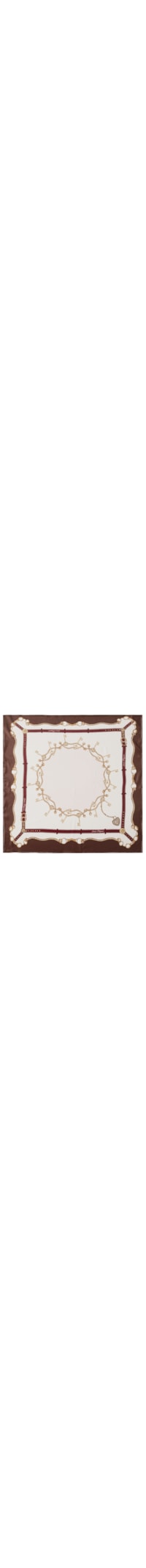 O lenço rosa é confeccionado em tecido leve de toque acetinado, sem elasticidade. A peça possui formato quadrado, estampa localizada com motivo de correntes, chaves e elementos metálicos contrastantes, moldura com padronagem contínua e acabamento em costura delicada nas extremidades.
