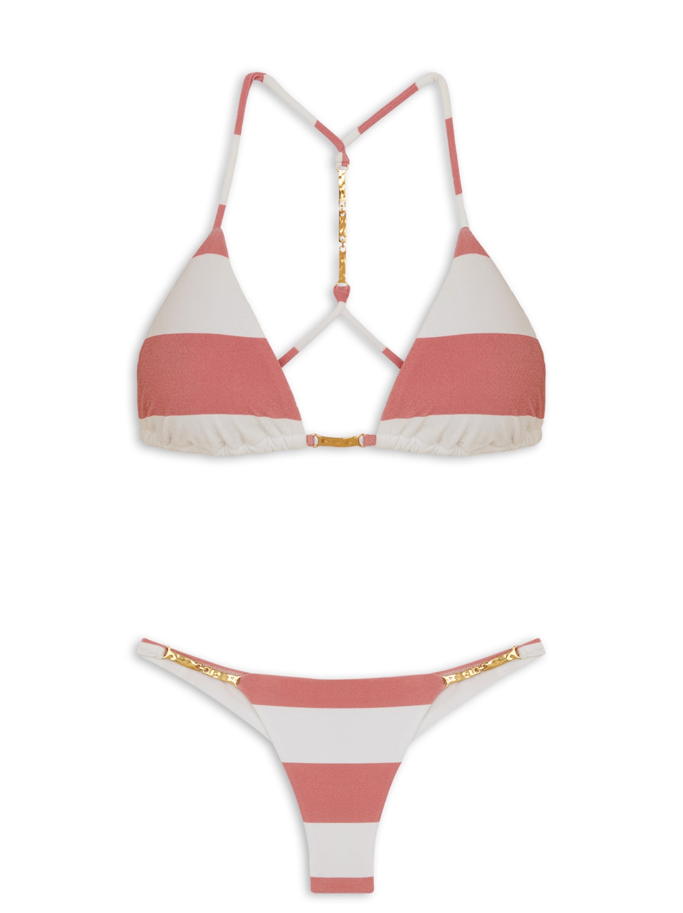O biquíni rosa é confeccionado em malha de poliamida com alta elasticidade. O top de modelo cortininha possui alças finas com detalhe de nó e aviamento metálico dourado na parte posterior, aviamento metálico na parte frontal, estampa de listras em cor contrastante e fechamento posterior por amarração. A calcinha de modelo tanga possui laterais finas com aviamento metálico dourado aplicado, estampa de listras em cor contrastante, tag da marca em metal dourado aplicado na parte posterior e forro.