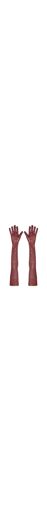 A luva vinho é produzida em tule com aplicação de paetês por toda a superfície. O acessório possui modelo longo com comprimento acima do cotovelo, estrutura ajustada ao braço, formato anatômico para as mãos, acabamento interno delicado e visual.