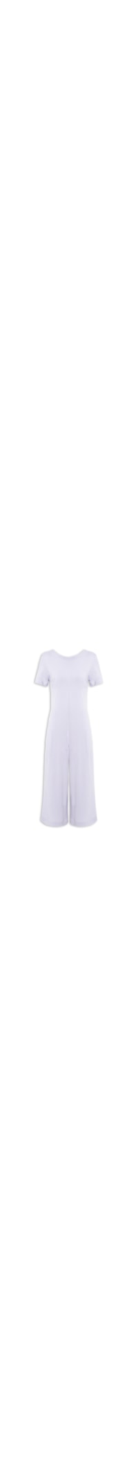 O macacão lilás é confeccionado em malha leve com toque de linho. A peça possui decote canoa frontal e decote em v posterior, mangas curtas, shape solto, bolsos frontais de modelo faca, comprimento longo, caimento reto e acabamento pespontado.