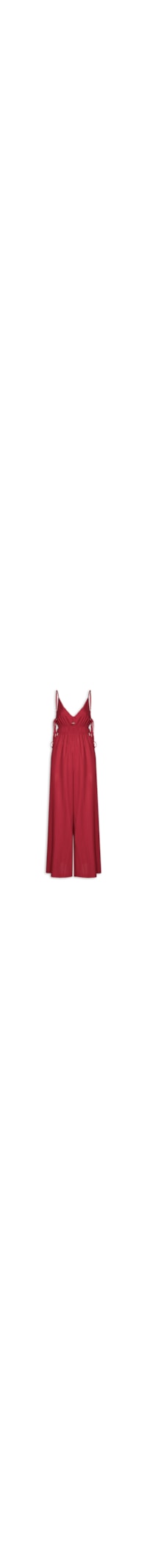 O macacão vermelho é confeccionada em tecido encorpado sem elasticidade com um toque de linho. A peça solta ao corpo possui decote V, alças finas reguláveis, pences e decote vazado no busto, efeito franzido por elástico abaixo do busto, recortes vazados nas laterais com tiras alongadas e miçangas nas pontas para amarração e comprimento longo.