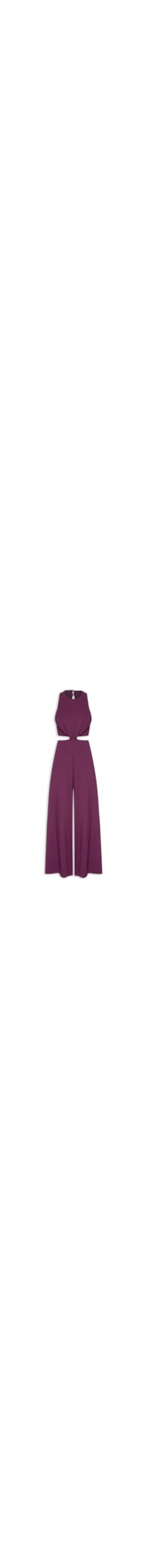 O macacão roxo é confeccionado em malha de algodão de baixa elasticidade. A peça solta ao corpo, possui decote redondo, alças largas, cavas estendidas, recortes laterais vazados e detalhe com nó frontal, recorte posterior vazado, elástico embutido na parte posterior da cintura, barra alongada, comprimento longo, forro superior e fechamento posterior por botões.