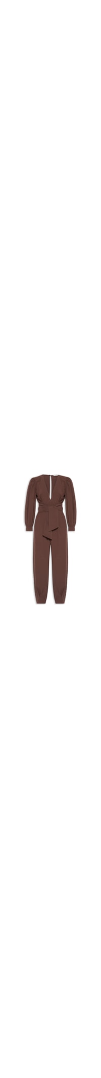 O macacão marrom é confeccionado em tecido leve sem elasticidade. A peça solta ao corpo possui decote V profundo, mangas longas amplas com ajuste nos punhos, bolsos frontais modelo faca, pregas frontais, abertura posterior com fechamento por botão e fechamento posterior por zíper invisível. Acompanha cinto do mesmo tecido e cor, de espessura média, para uso opcional.