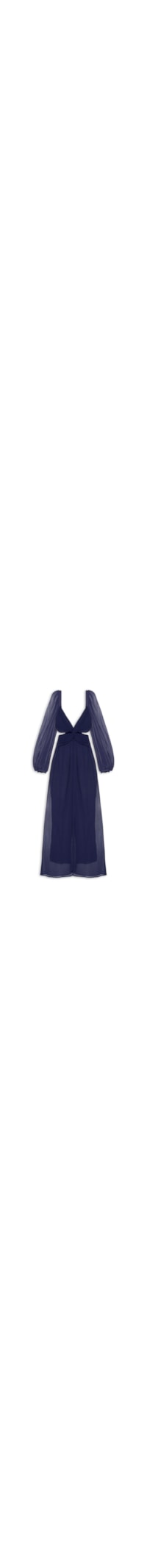 O vestido azul marinho é confeccionado em tule sem elasticidade. A peça justa ao busto e solta no comprimento possui decote V com recorte torcido, recorte vazado na altura da cintura, mangas longas com elástico embutido nos punhos, comprimento longo e fechamento posterior por zíper.