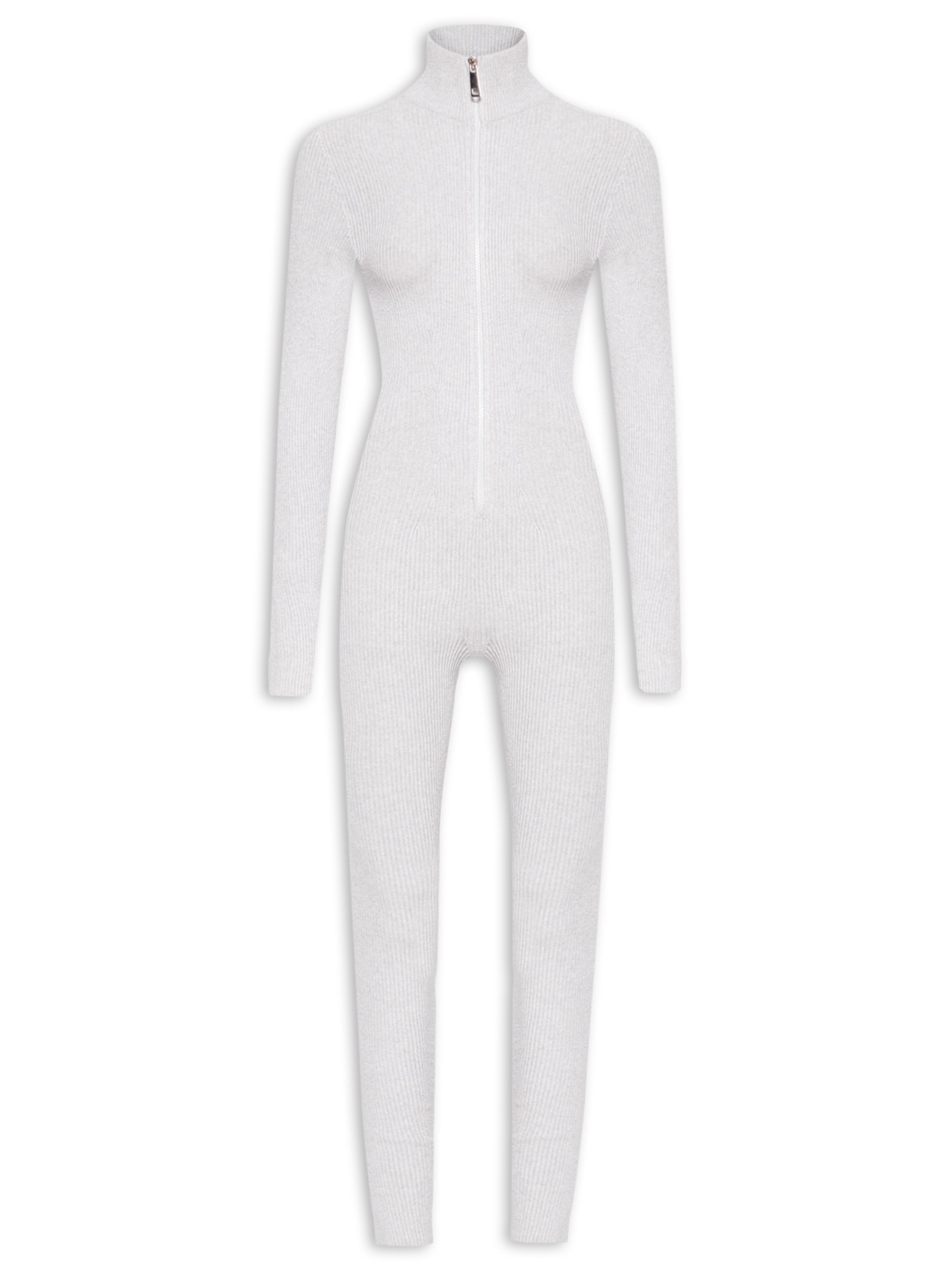 O macacão cinza é confeccionado em tricot com superfície canelada e média elasticidade. A peça justa ao corpo possui gola alta, mangas longas com abertura para o dedo, comprimento longo e fechamento frontal por zíper.