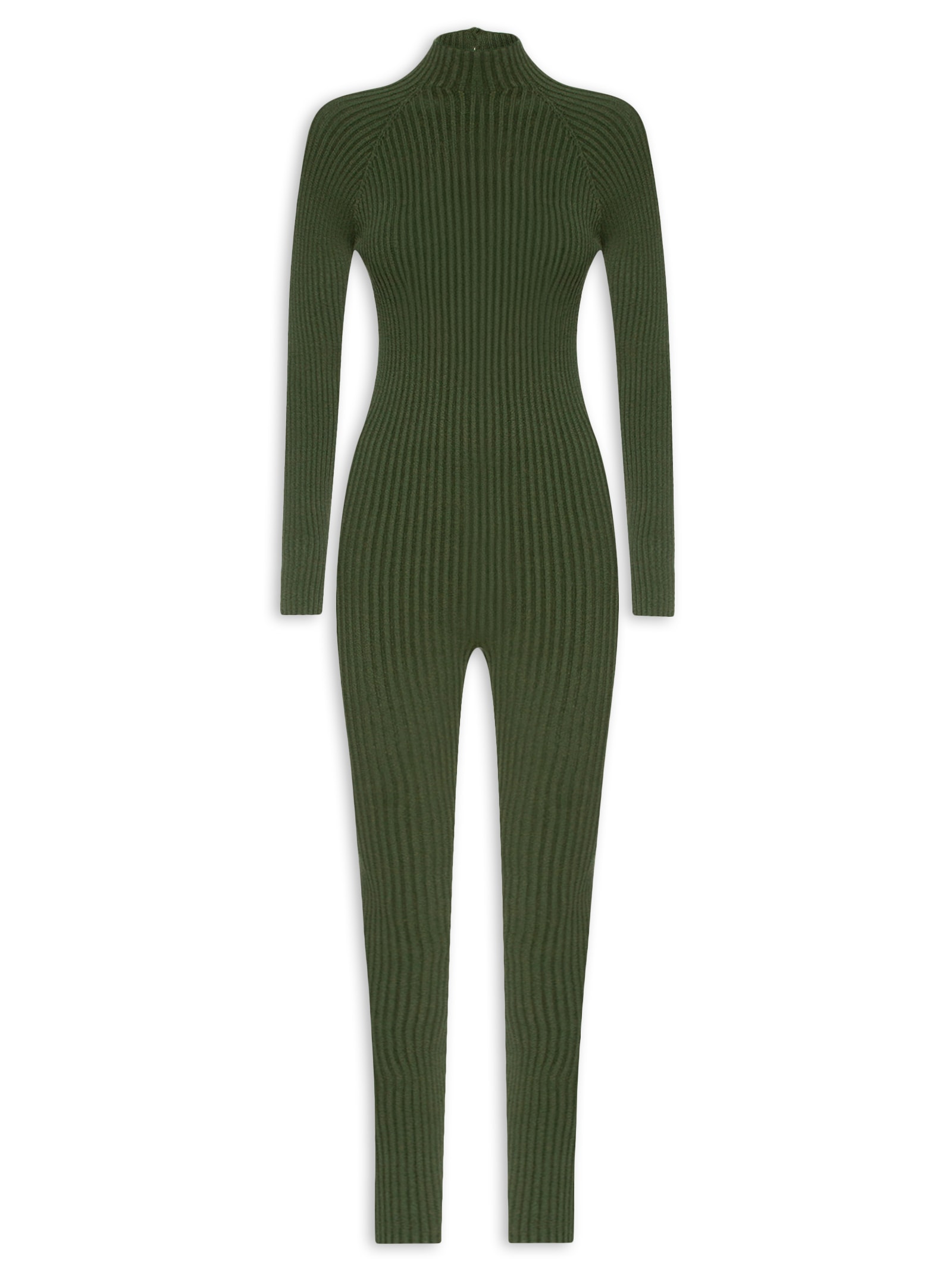 O macacão verde é confeccionado em tricot canelado com alta elasticidade. A peça justa ao corpo possui gola alta com fechamento posterior por botões, mangas longas com abertura para dedos nos punhos, recorte posterior vazado e comprimento longo.