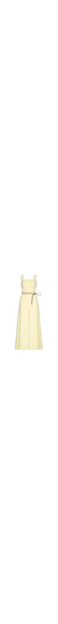 O macacão amarelo é confeccionado em tecido leve sem elasticidade. A peça justa ao busto e solta no comprimento possui decote reto, alças médias com lastéx na parte posterior, passantes nas laterais na altura da cintura, pences frontais e posteriores, forro curto e fechamento posterior por zíper invisível. Acompanha cinto removível para amarração de uso opcional.