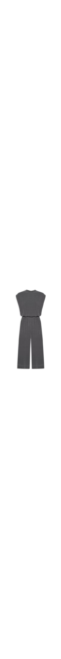 O macacão cinza é confeccionado em malha de algodão com média elasticidade. A peça solta ao corpo possui decote redondo com acabamento canelado, ombros estendidos com detalhe de pregas, elástico embutido na altura da cintura, bolsos frontais de modelo faca, barra estendida e comprimento cropped*.