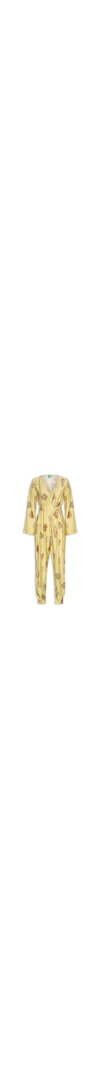 O macacão verde é confeccionado em tecido leve sem elasticidade. A peça solta ao corpo possui decote V profundo transpassado, mangas longas, elástico embutido e faixas alongadas na parte frontal para amarração na altura da cintura, mix de estampas em cores contrastantes e comprimento longo.